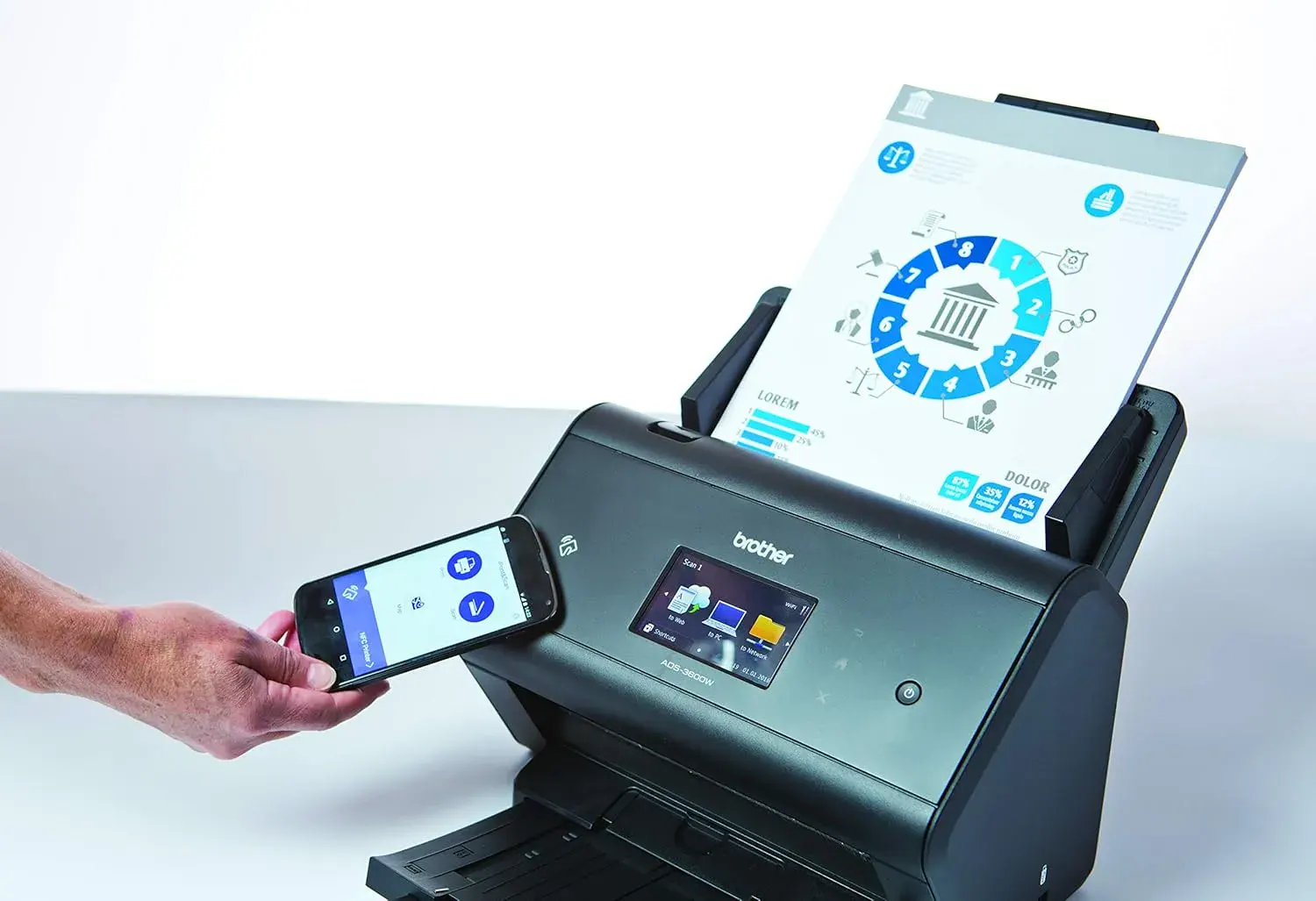 Bộ nạp tài liệu tự động (ADF) 50 tờ, quét liên tục, tiết kiệm thời gian.