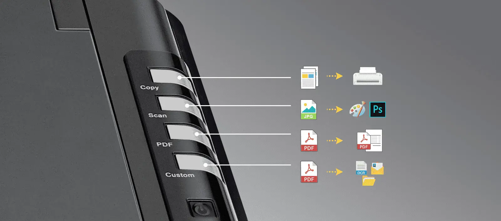 - Nút chức năng: Copy – Scan – PDF – Custom